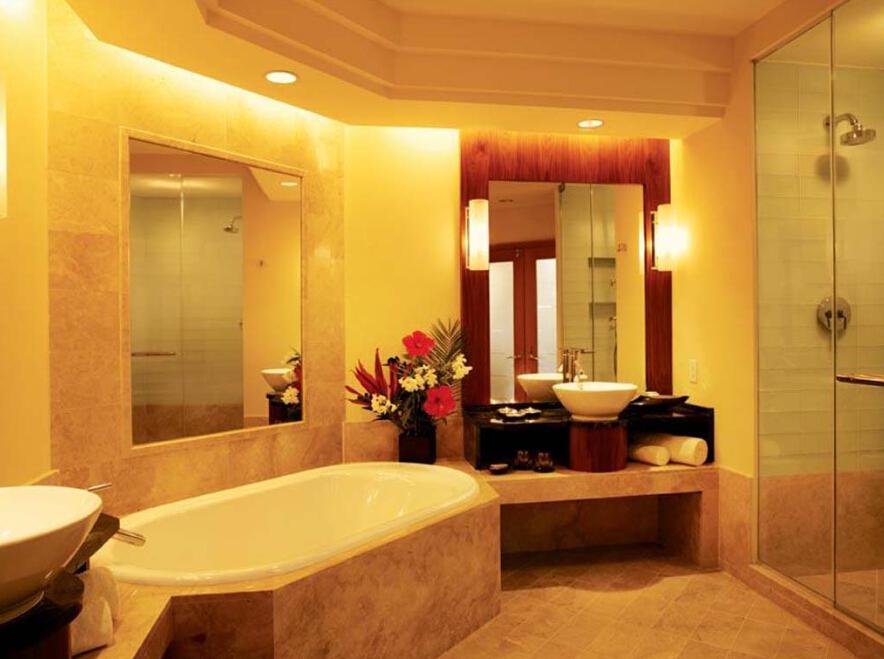 浴室的淋浴、坐厕等功能区域,照明应以柔和的光线为主。照度要求不高,但光线需均匀。由于此区域用水频率很高,光源本身还要有、散热和不易积水的结构。一般来说,在5平方米的空间里要用60W的光源进行照明,灯具的显色指数要求不高,白炽灯、荧光灯、气体灯都可以。相对来讲,墙面光比较适合浴室空间环境,这样可以减少顶光源带来的阴影效应。